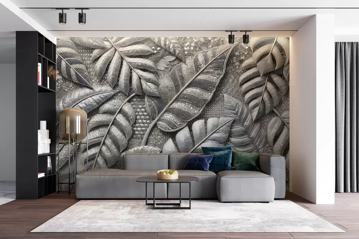 Тапете за зид Велики тропски листови у деликатним сребрним тоновима, у текстурираном мозаичком стилу бр. w02135