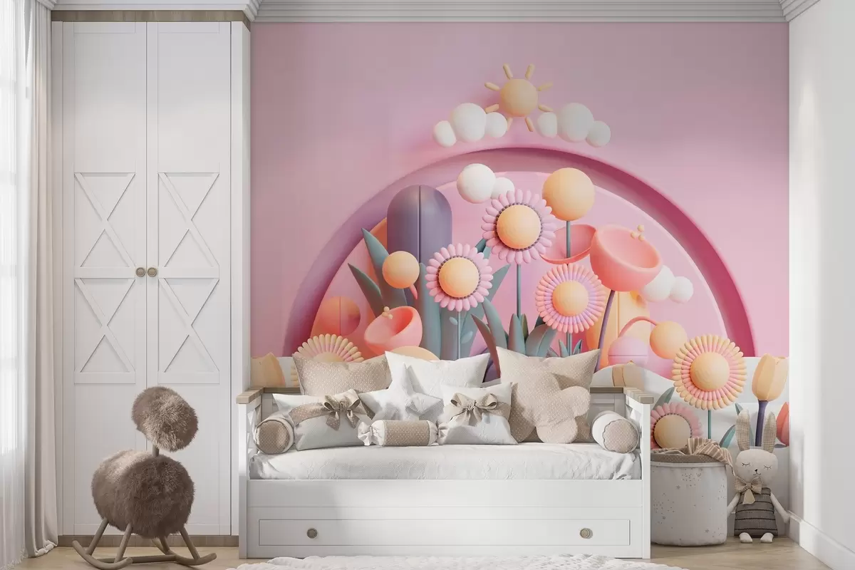Тапете за зид Дечија тапета у 3Д стилу са цвећем и облацима у ружичастим нијансама бр. w02136