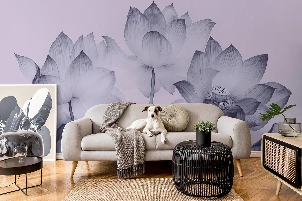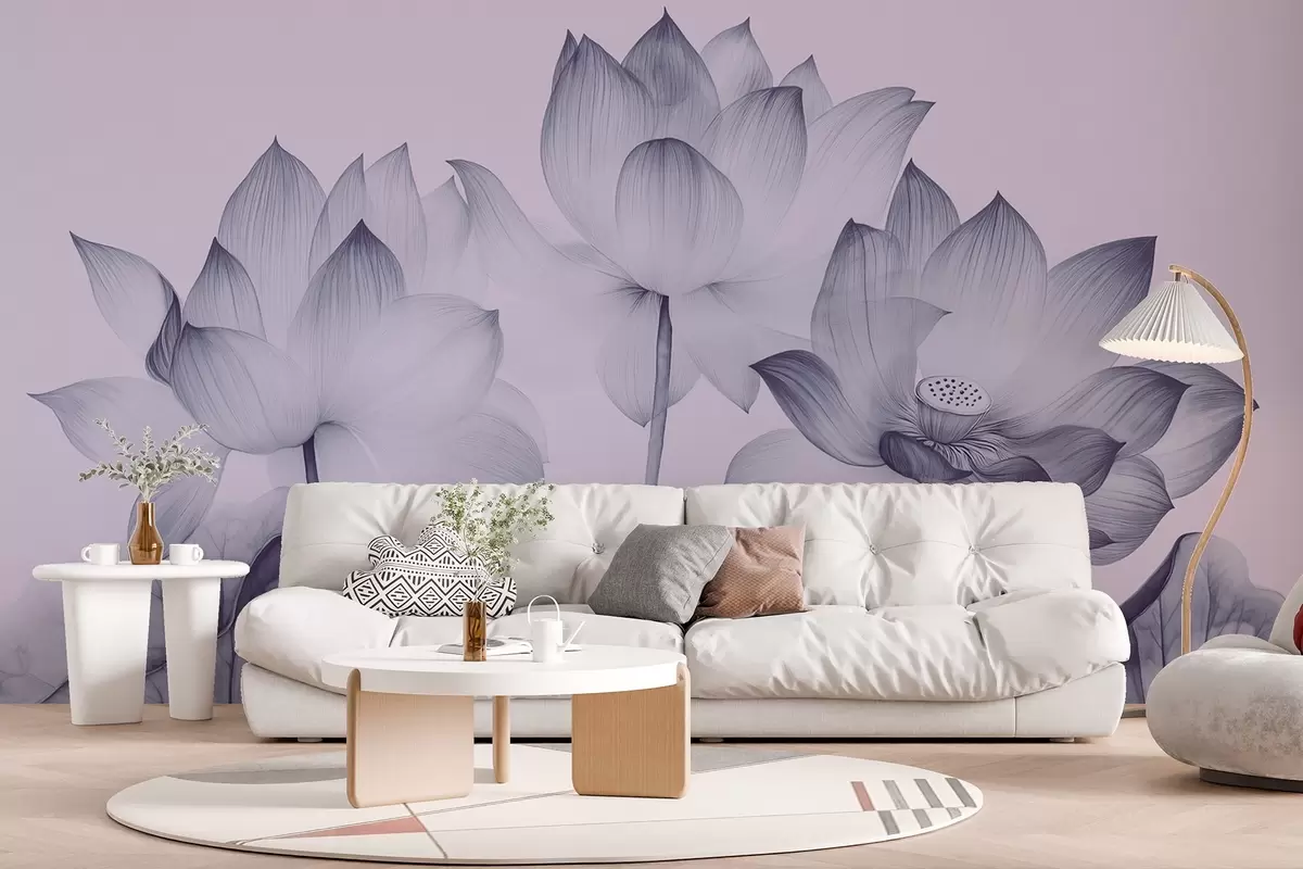 Тапете за зид Три лотоса са листовима у стилу кинеског сликарства у плавој боји бр. w02146v2