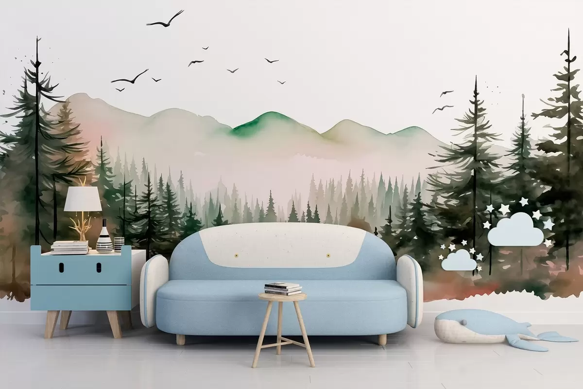 wall murals Акварел шумски и планински пејзажи, зелене и розе боје w02150v1