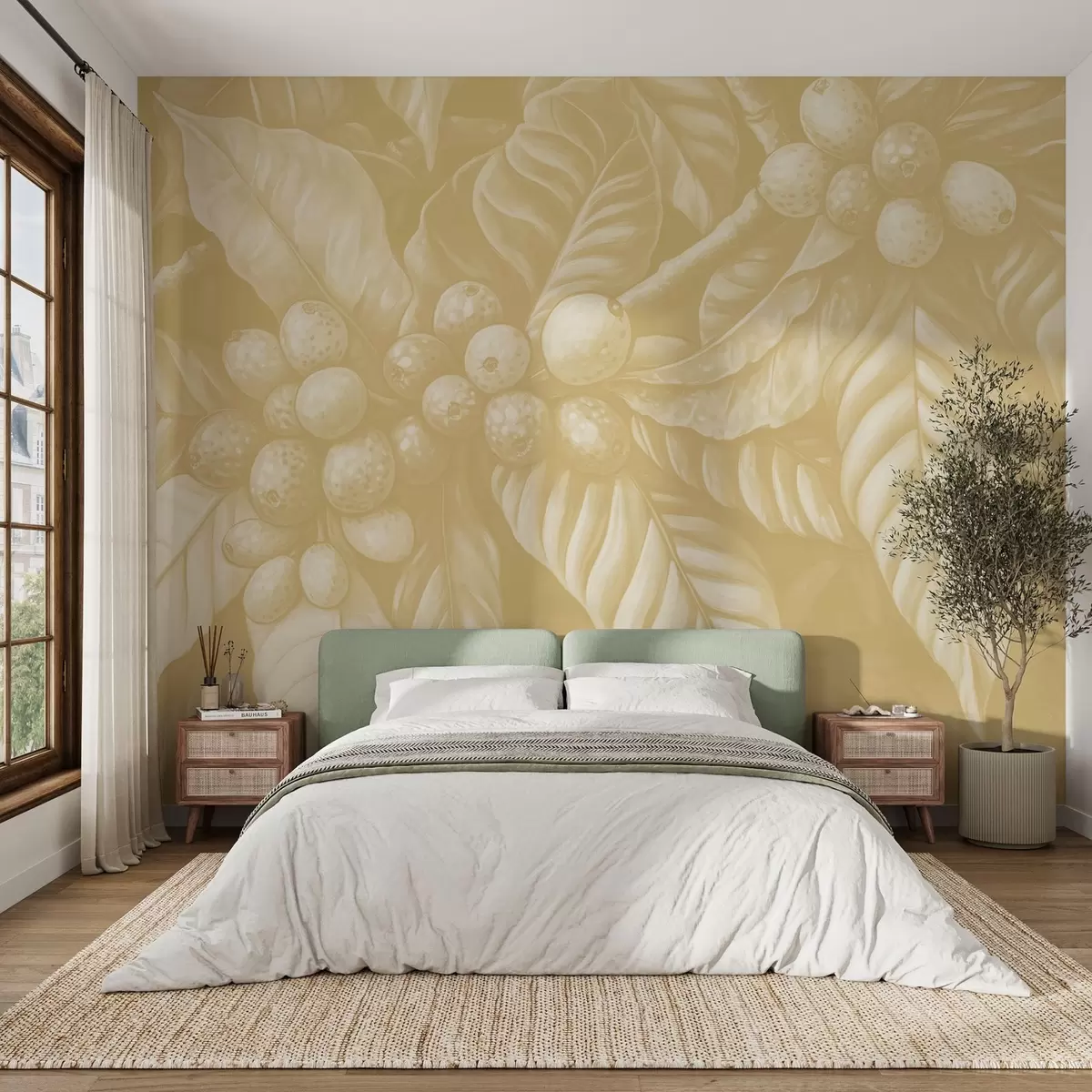 Тапете за зид Гране биљке кафе са воћем и тропским елементима у беж нијансама бр. w02209v1