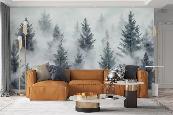 Тапете за зид Прелепа шума са боровима, магла, пејзажи природе, сиве боје бр. w02222v2
