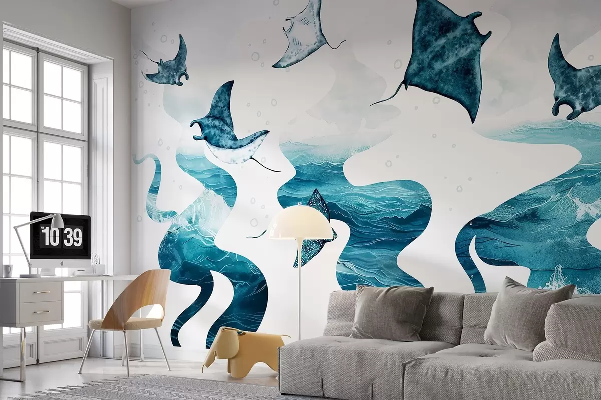 Тапете за зид Риба манта, акварел стил, море, океан, плаве боје бр. w02266