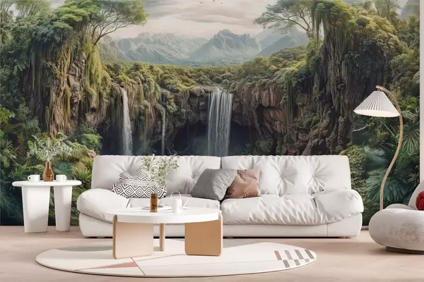 Тапете за зид велика панорама кањона са дрвећем и водопадом бр. w02294