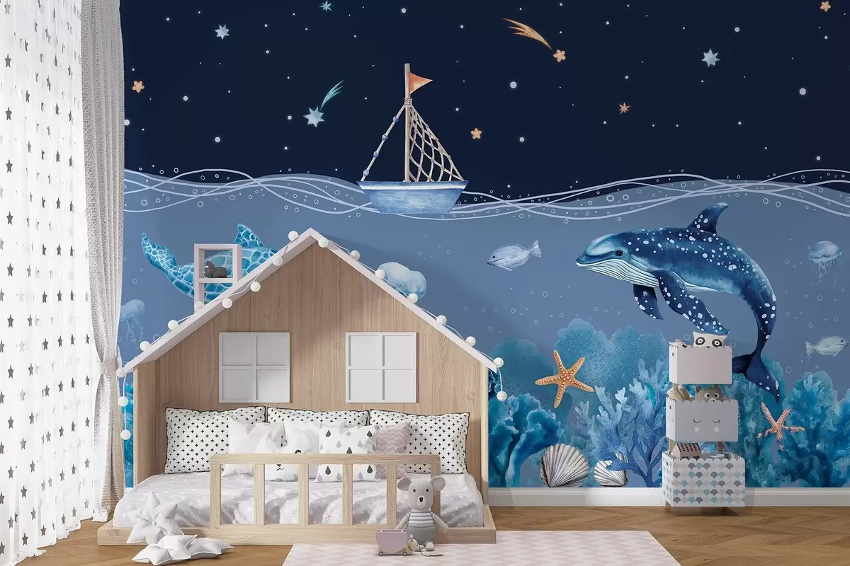 Тапете за зид Морски живот, стил акварела, корали, чамац, делфин, медузе, звездано ноћно небо, плаве боје бр. w02310