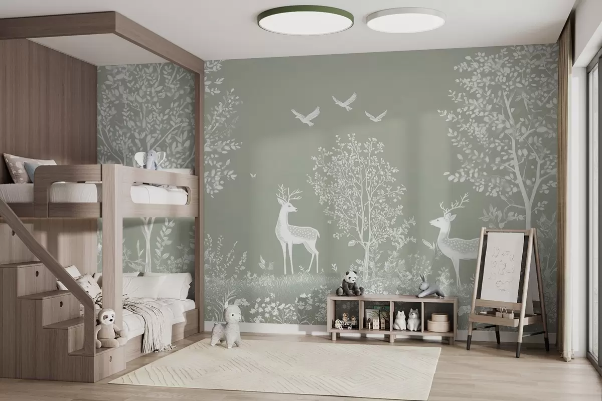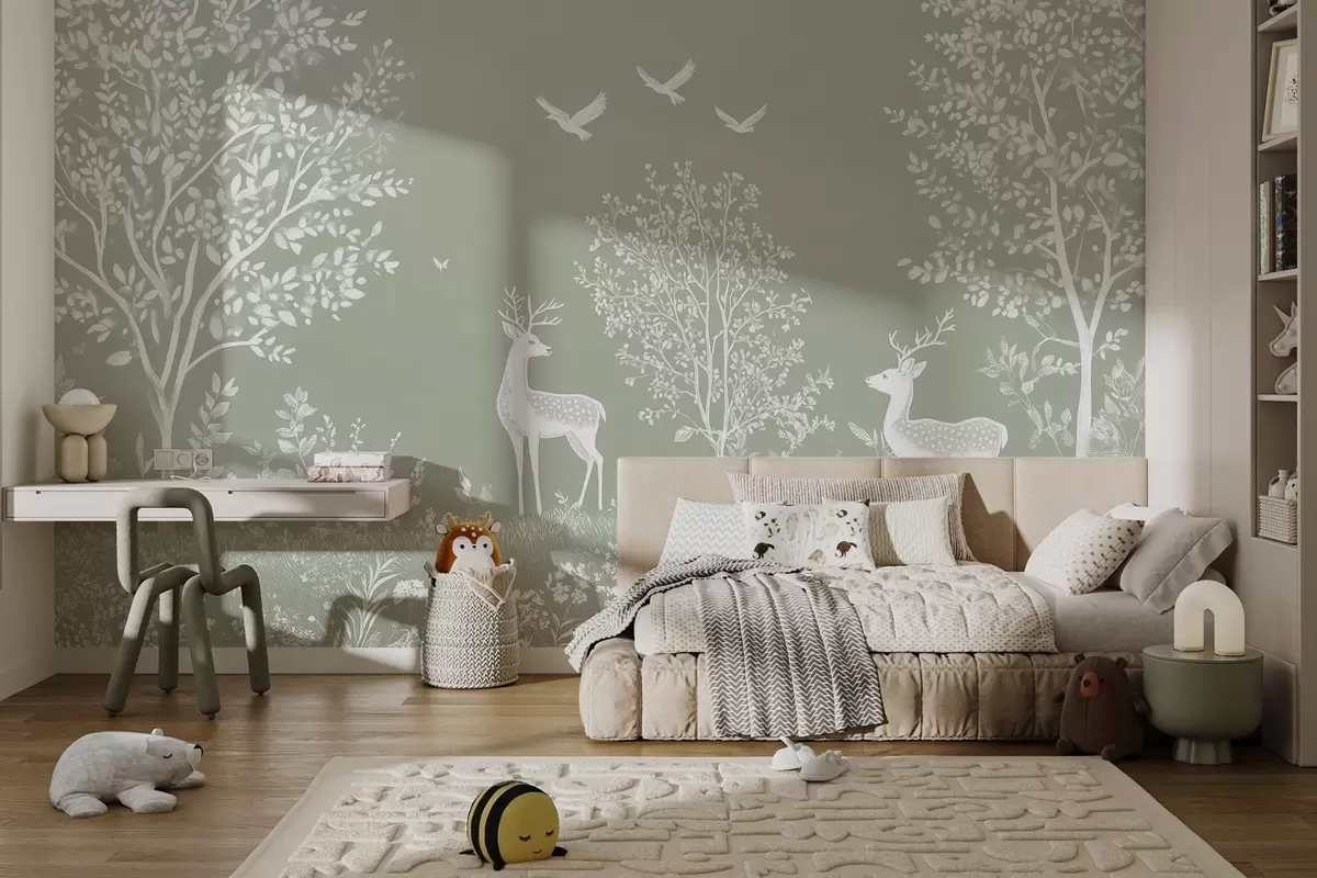 Тапете за зид шума са јеленима у стилу цртежа кредом на позадини маслине бр. w02444v1