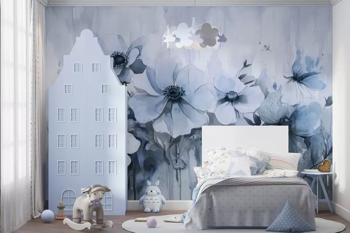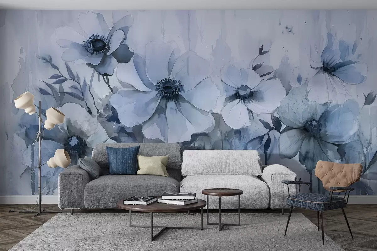 Тапете за зид Рустично цвеће, цртеж у акварелу, плаве боје бр. w02487v1