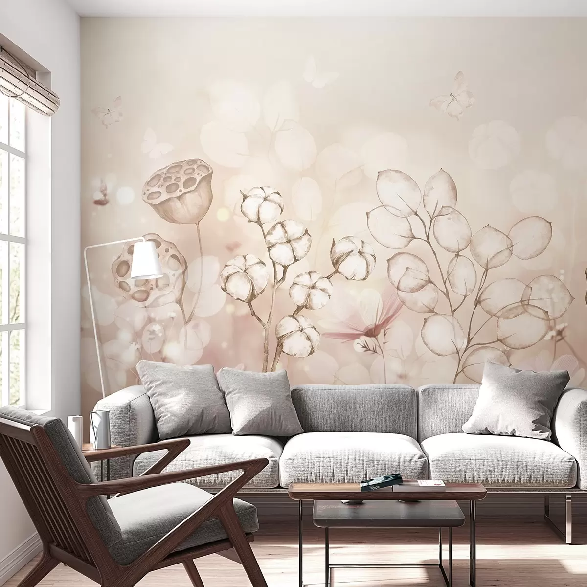 wall murals Сањиви цветни врт, лептир, цвеће памука, лотоси, беж боје w02516v3