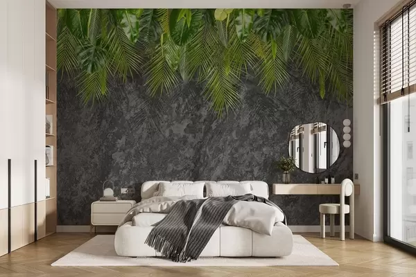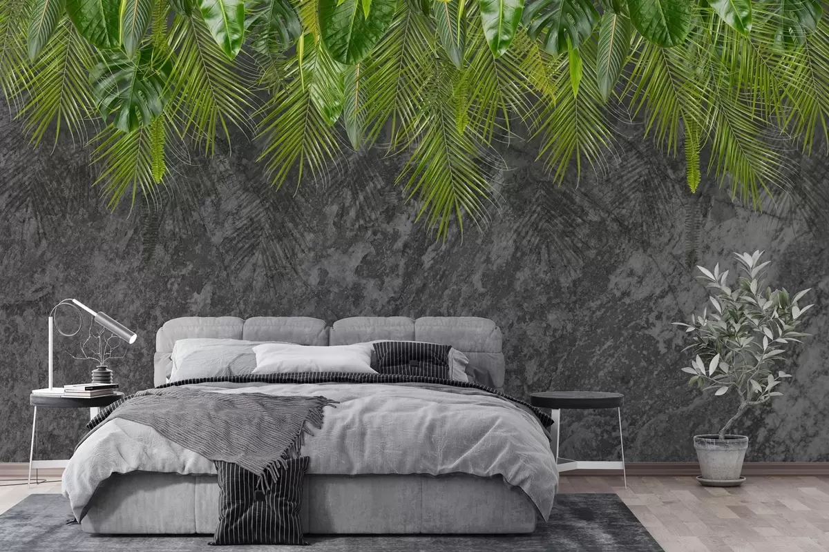 Тапете за зид тропско лишће на позадини имитације камена бр. w02547