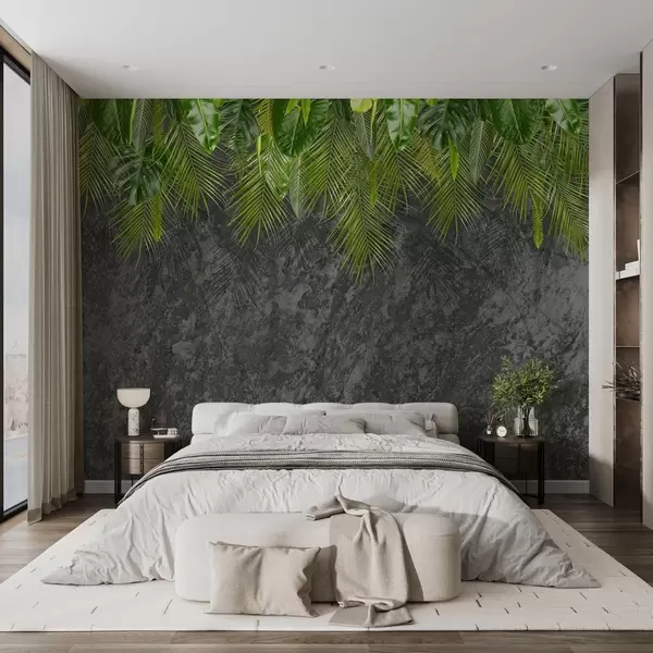 Тапете за зид тропско лишће на позадини имитације камена бр. w02547