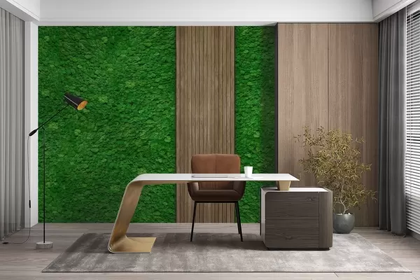 Тапете за зид Зид у стилу маховине са дрвеним панелом, бујне зелене боје бр. w02656