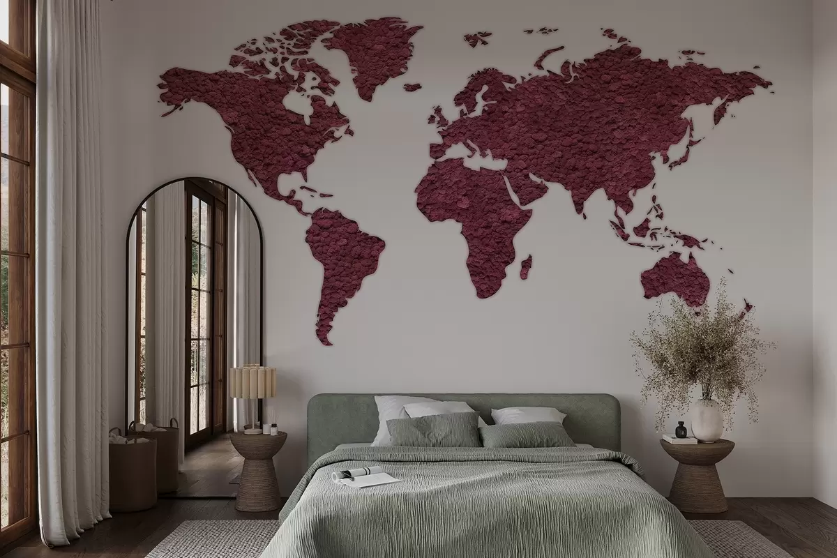 Тапете за зид Мапа света са маховином, природом, бордо палетом боја бр. w02657v5