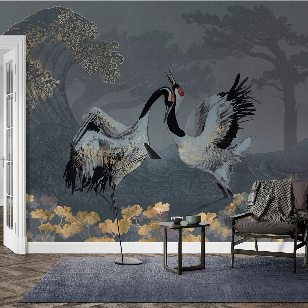 Тапете за зид Ждралови, дрвеће и таласи са елементима у кинеском стилу бр. w02747