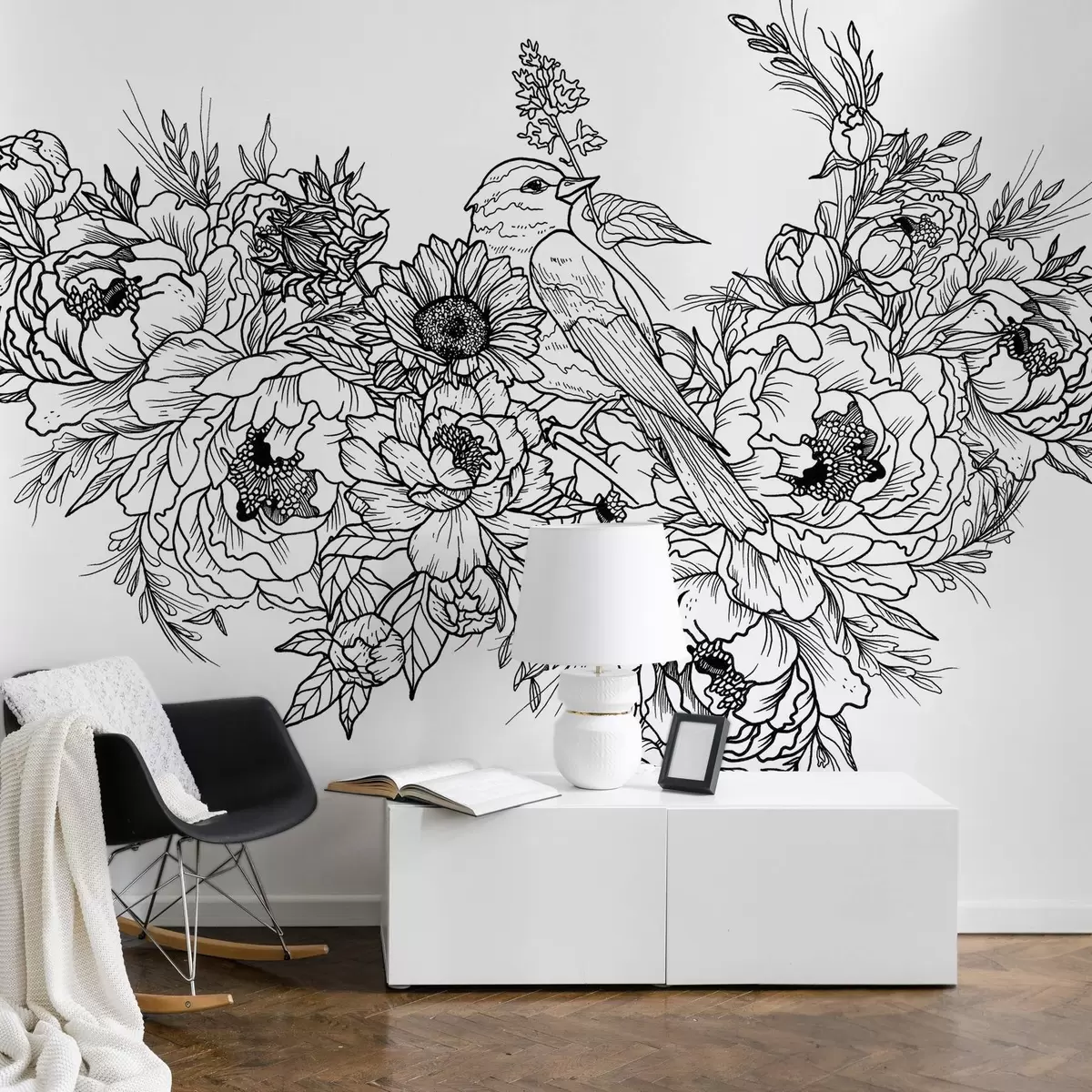 wall murals Детаљна цртана уметност птица и цветни аранжман w02833v1