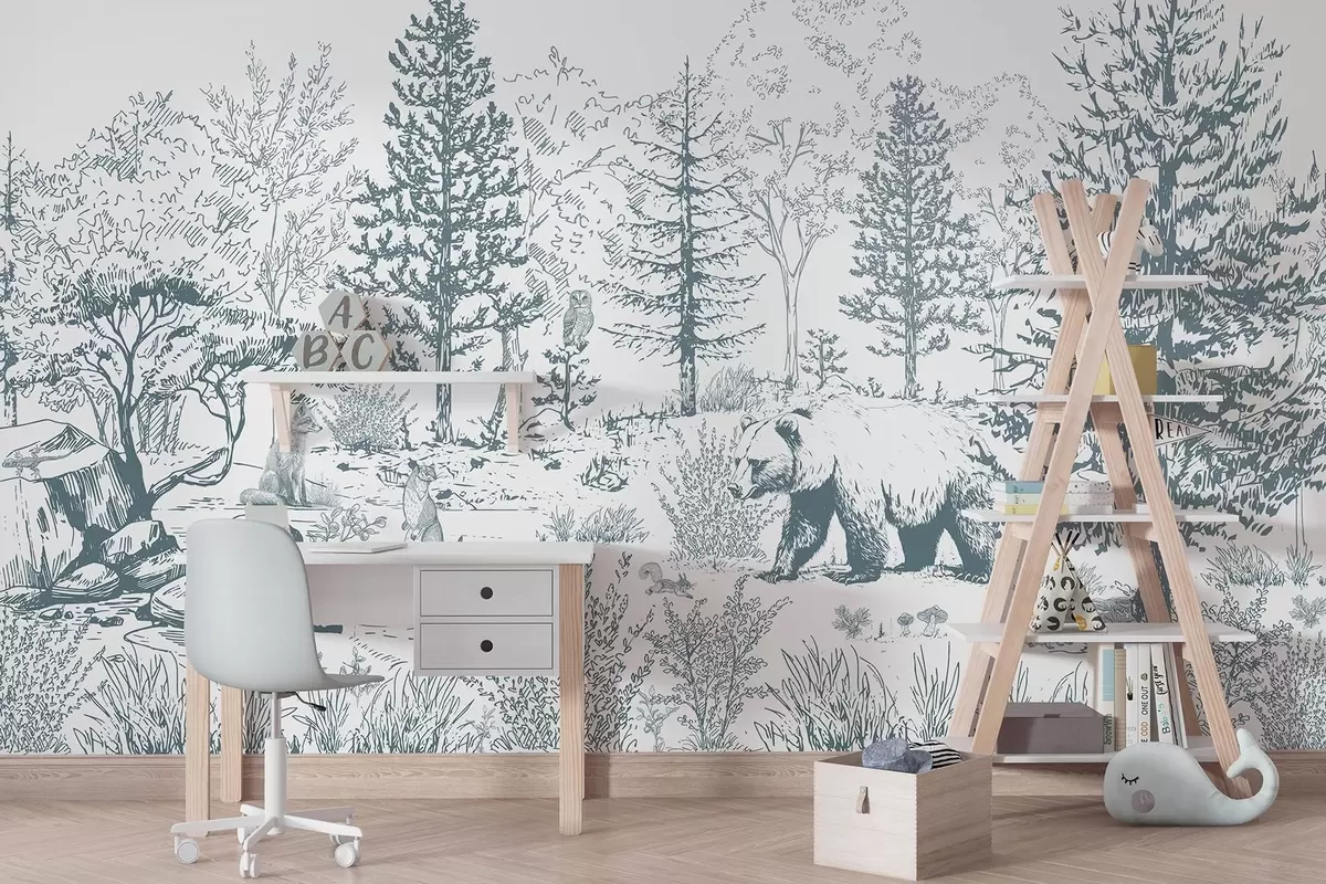 Тапете за зид Живот у шуми, дрвеће, дивље животиње, медвед, лисица, сова, жбуње, цртеж у стилу оловке, плаве боје бр. w02929v1
