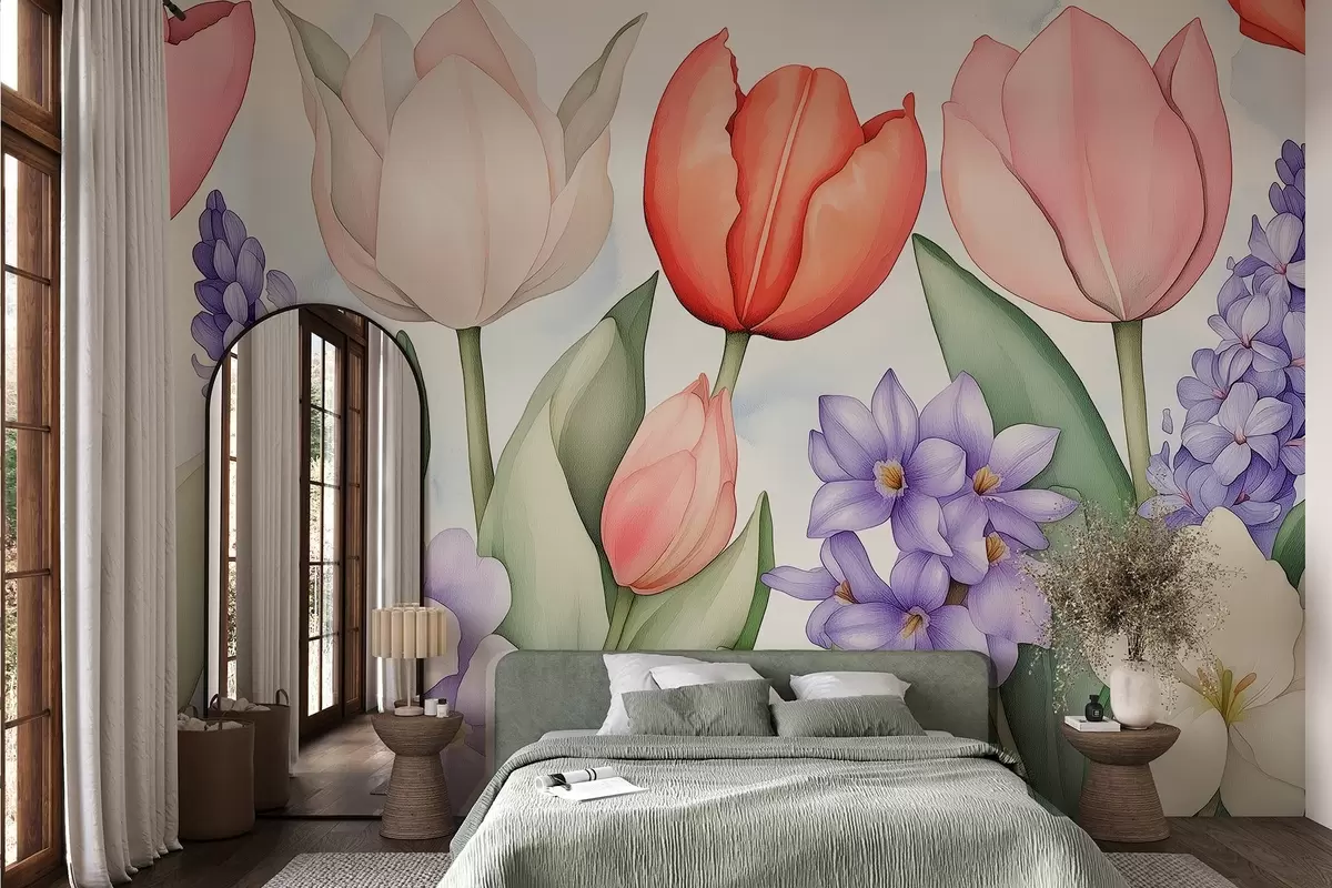 Тапете за зид Пролећно цвеће, лале, зумбул, цртеж у акварелу, цветни бр. w02940