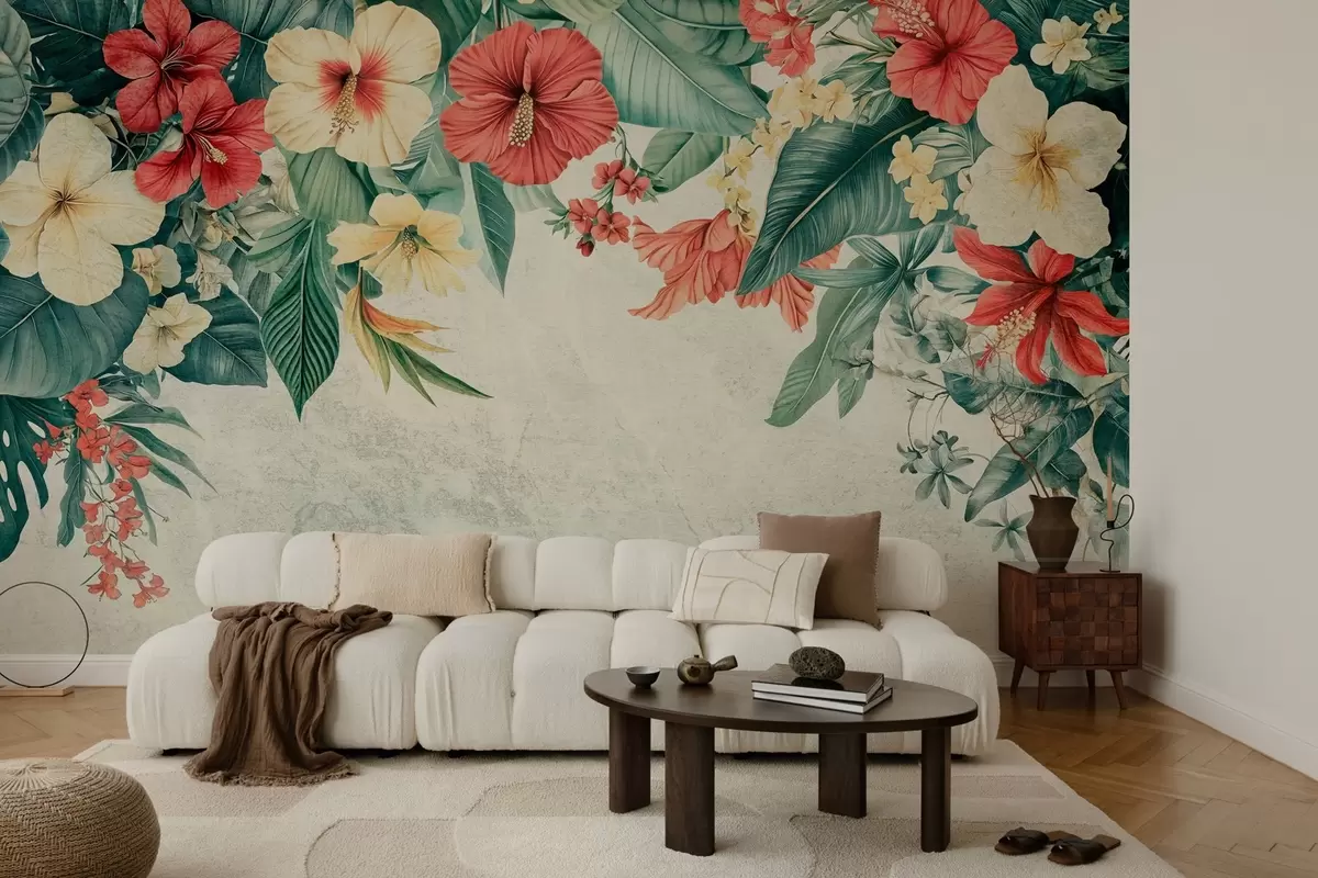 wall murals тропско цвеће и биљке које висе одозго на текстурираној позадини w03023