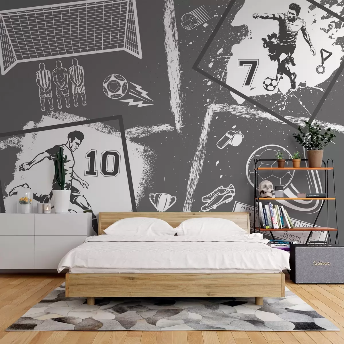 Тапете за зид Фудбалери, лопта и остали фудбалски атрибути у сивим тоновима бр. w03122v1