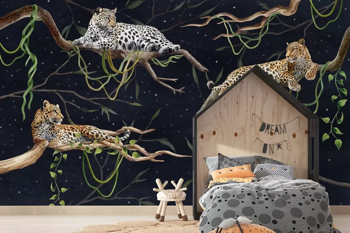 wall murals Леопарди на дрвећу џунгле, лијане, тропске, дивље животиње, ноћно небо са звездама w03148
