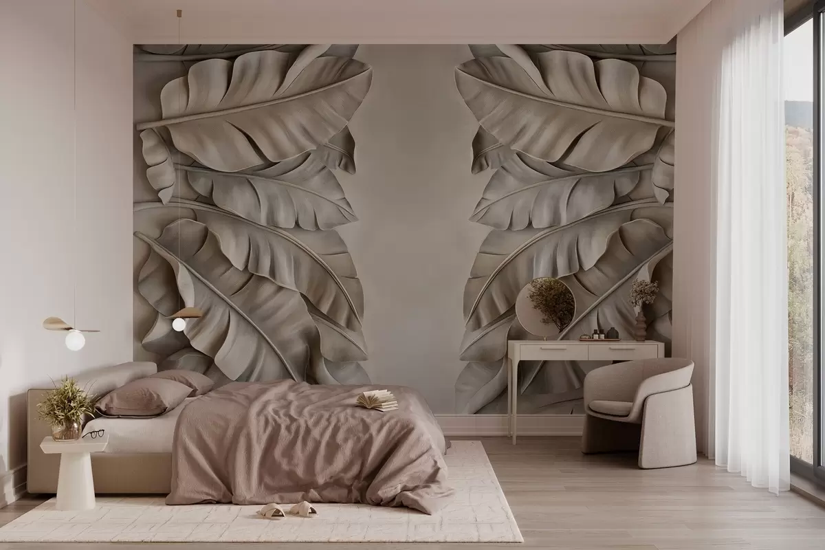 wall murals имитација барељефа са тропским листовима у беж тоновима w03285