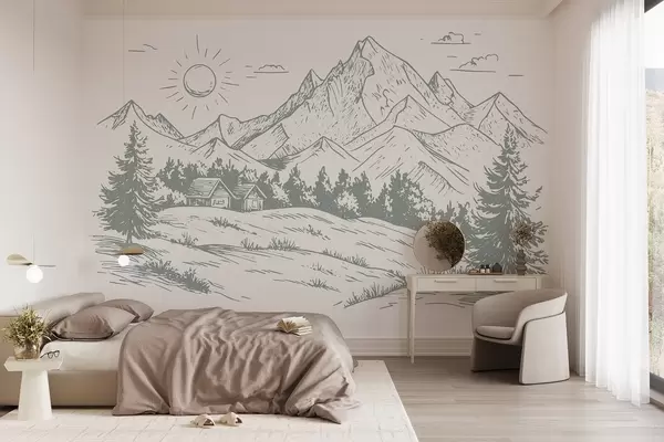 Тапете за зид Планински цртеж, пејзажи природе, шума, дрвене куће, боја нане бр. w03347v1