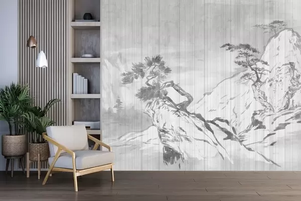 Тапете за зид Традиционална кинеска монохромна илустрација пејзажа са планинама, дрвећем и маглом, сива позадина бр. w03379v1