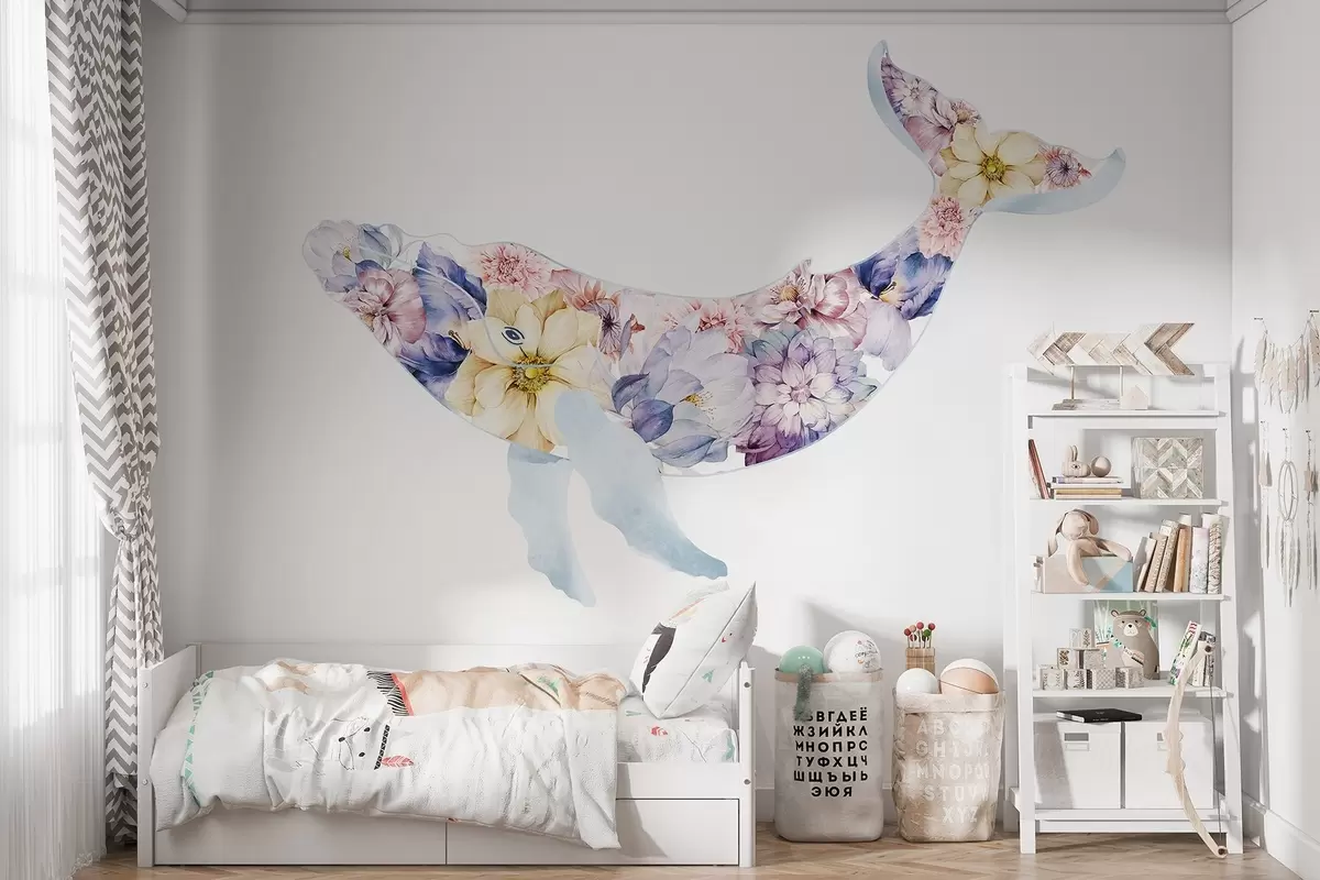 Тапете за зид Прелеп кит са акварелом цвећа, морске животиње, шарено бр. w03445
