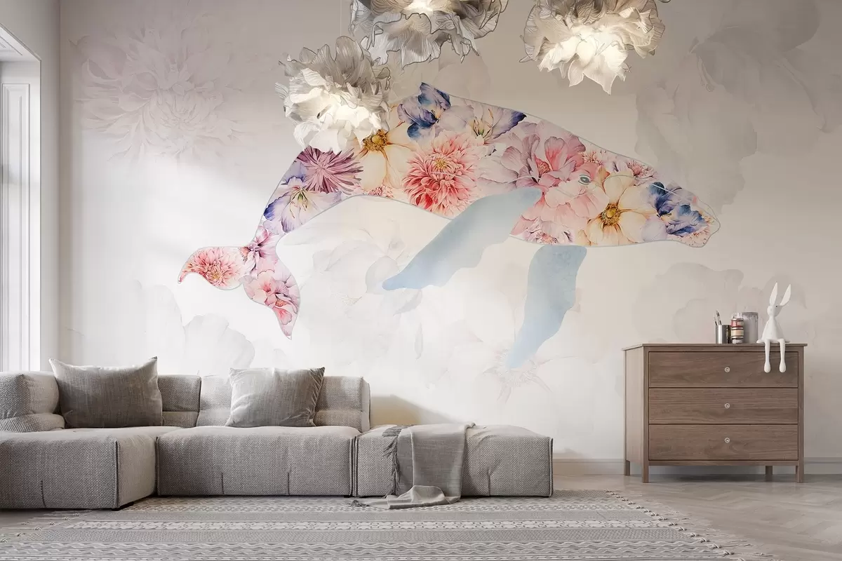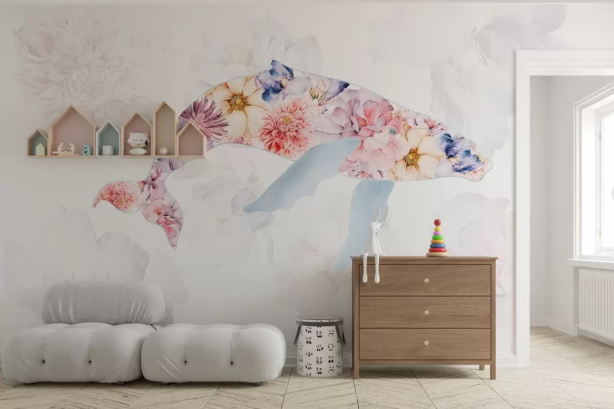 wall murals Кит са акварелним цвећем, океанске животиње, минимализам, шарено w03446