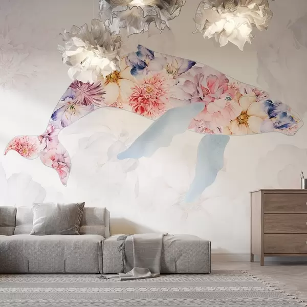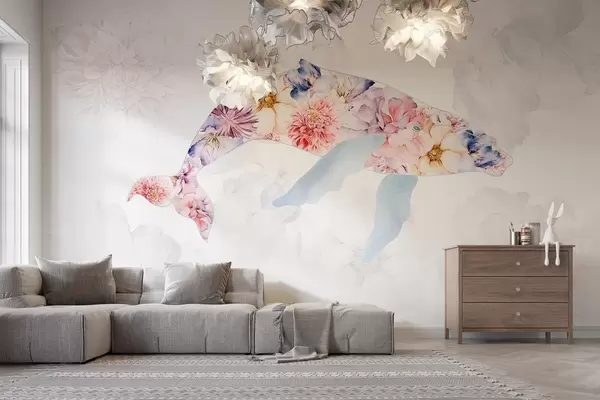 Тапете за зид Кит са акварелним цвећем, океанске животиње, минимализам, шарено бр. w03446