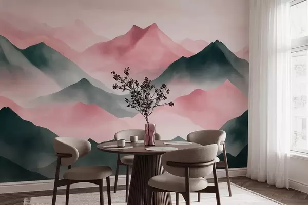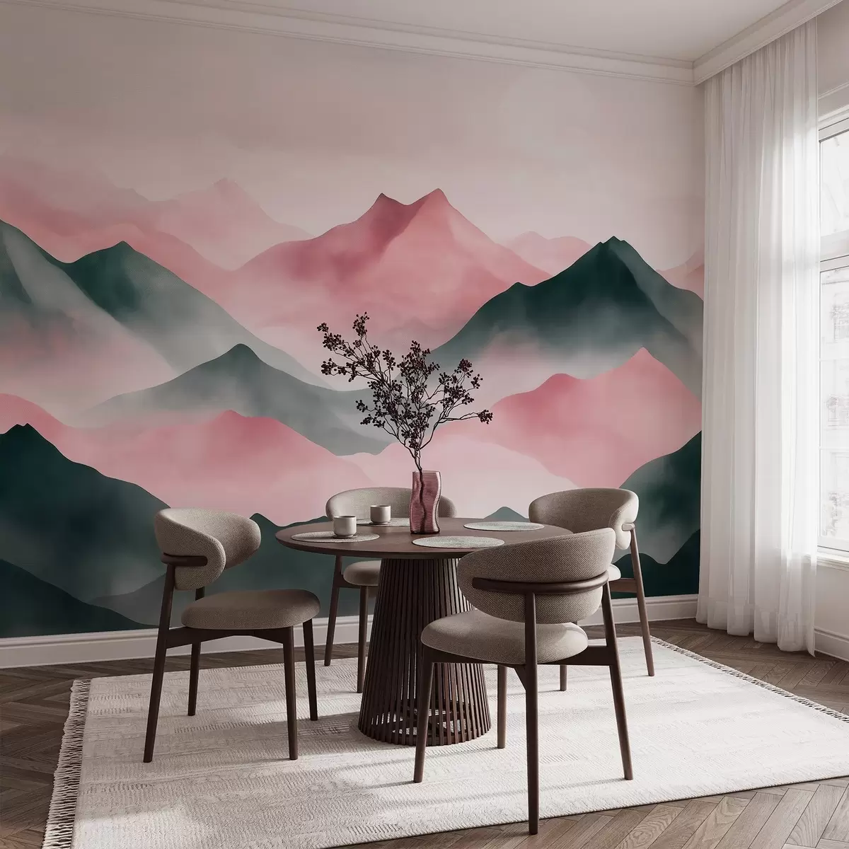 Тапете за зид Планински пејзажи, акварел стил, магла, розе и сива бр. w03548v1