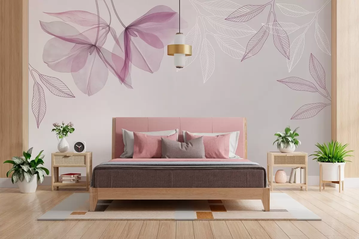 Тапете за зид нежни провидни цветови и листови у љубичастим тоновима бр. w03616v4
