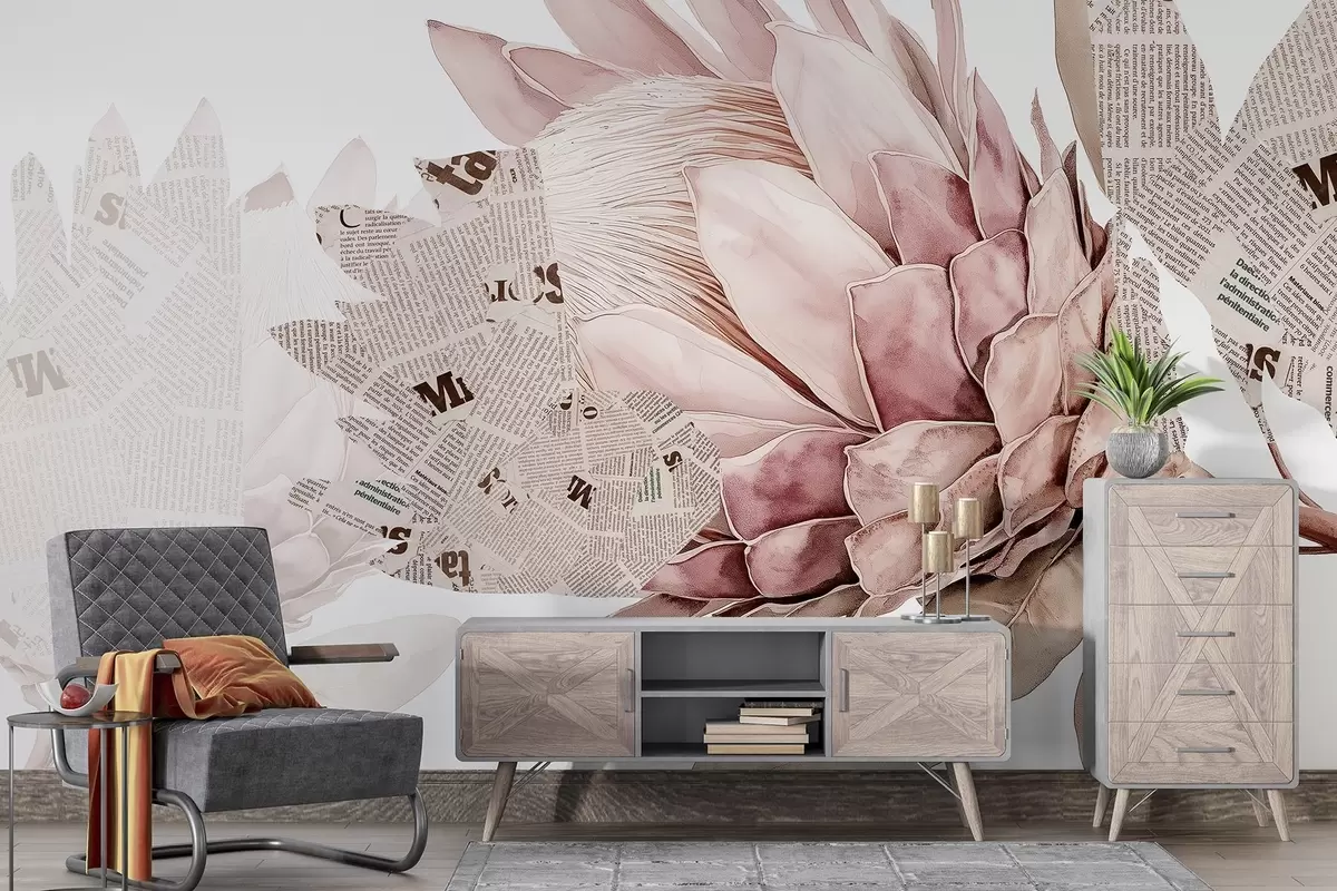 Тапете за зид Протеа цвеће, новинска уметност, цветне, тропске, пастелне беж боје бр. w03667v4