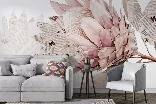 Тапете за зид Протеа цвеће, новинска уметност, цветне, тропске, пастелне беж боје бр. w03667v4