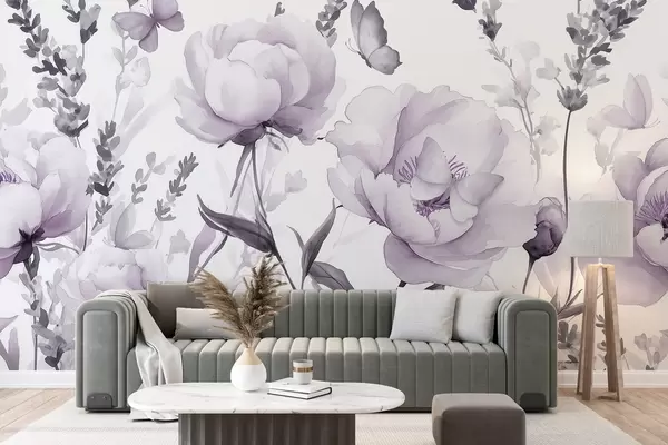 Тапете за зид Цветна ливада, божури, лаванда, лептири, акварел стил, љубичасте боје бр. w03668v3