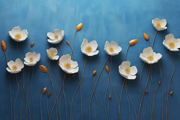 Тапете за зид Бело цвеће са жутим средиштима на плавој позадини бр. w03800