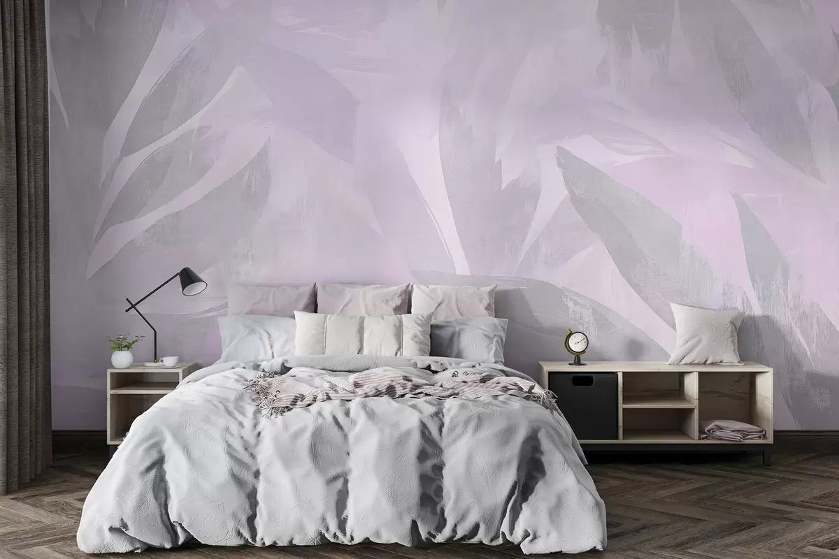 Тапете за зид Тропско лишће, цвеће, палме, пастелни стил, љубичасте боје бр. w03881v1
