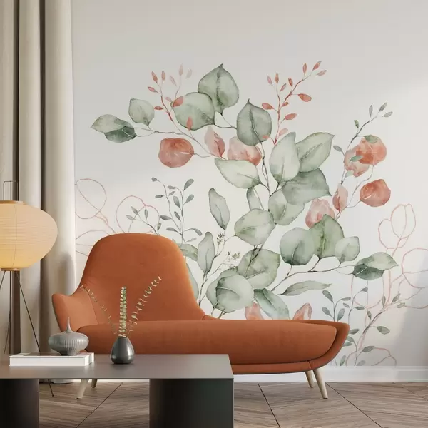 Тапете за зид Имитација вегетације и грана текстурираном акварелом, нијансе зелене и црвене бр. w03927v1