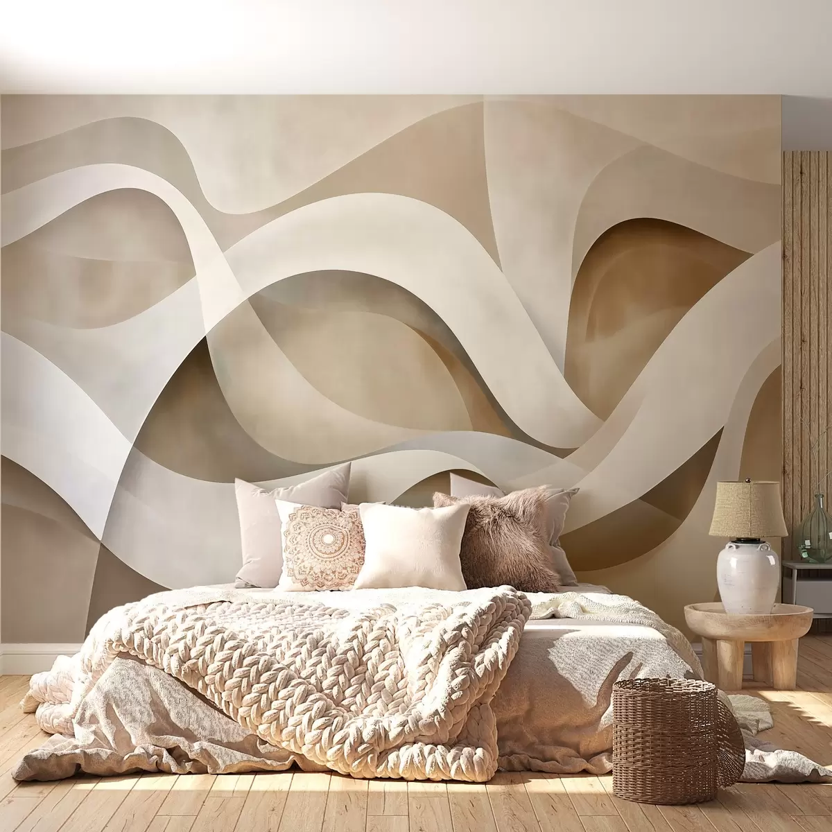 Тапете за зид Апстрактна минималистичка композиција слојевитих органских облика, сваки оивичен меком белом ивицом, испуњена густим унутрашњим линеарним потезима, попут текстуре тканине или папира, текуће кривине у неутралним беж, пешчаним, каменим и тоновима слоноваче, рељефни изглед бр. w03940