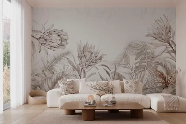 Тапете за зид Протеа међу тропским лишћем, беж нијансе бр. w03952