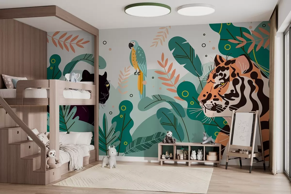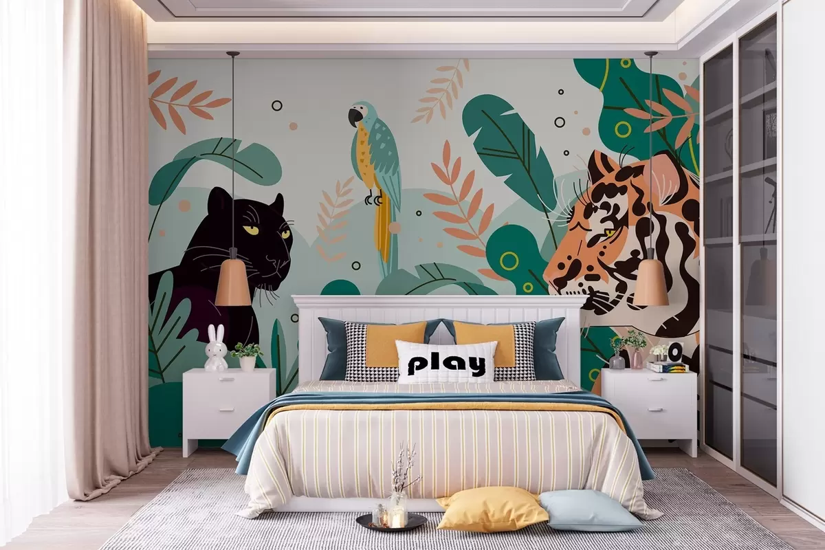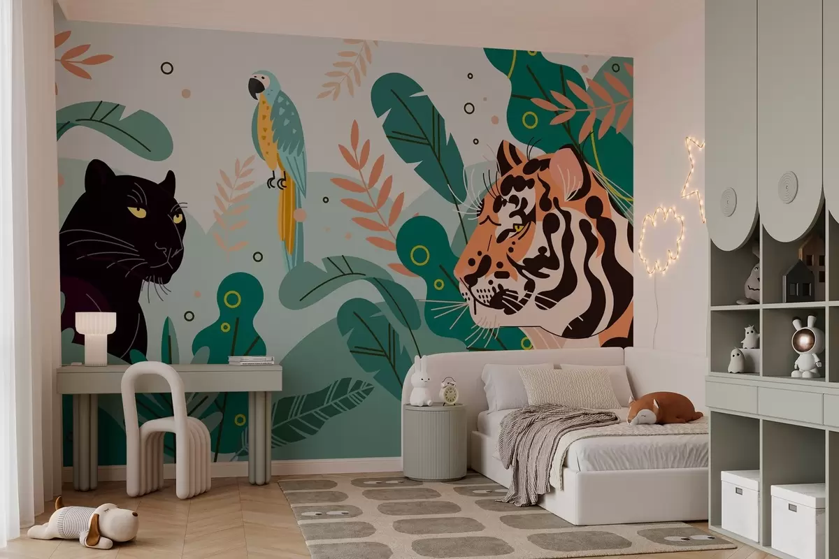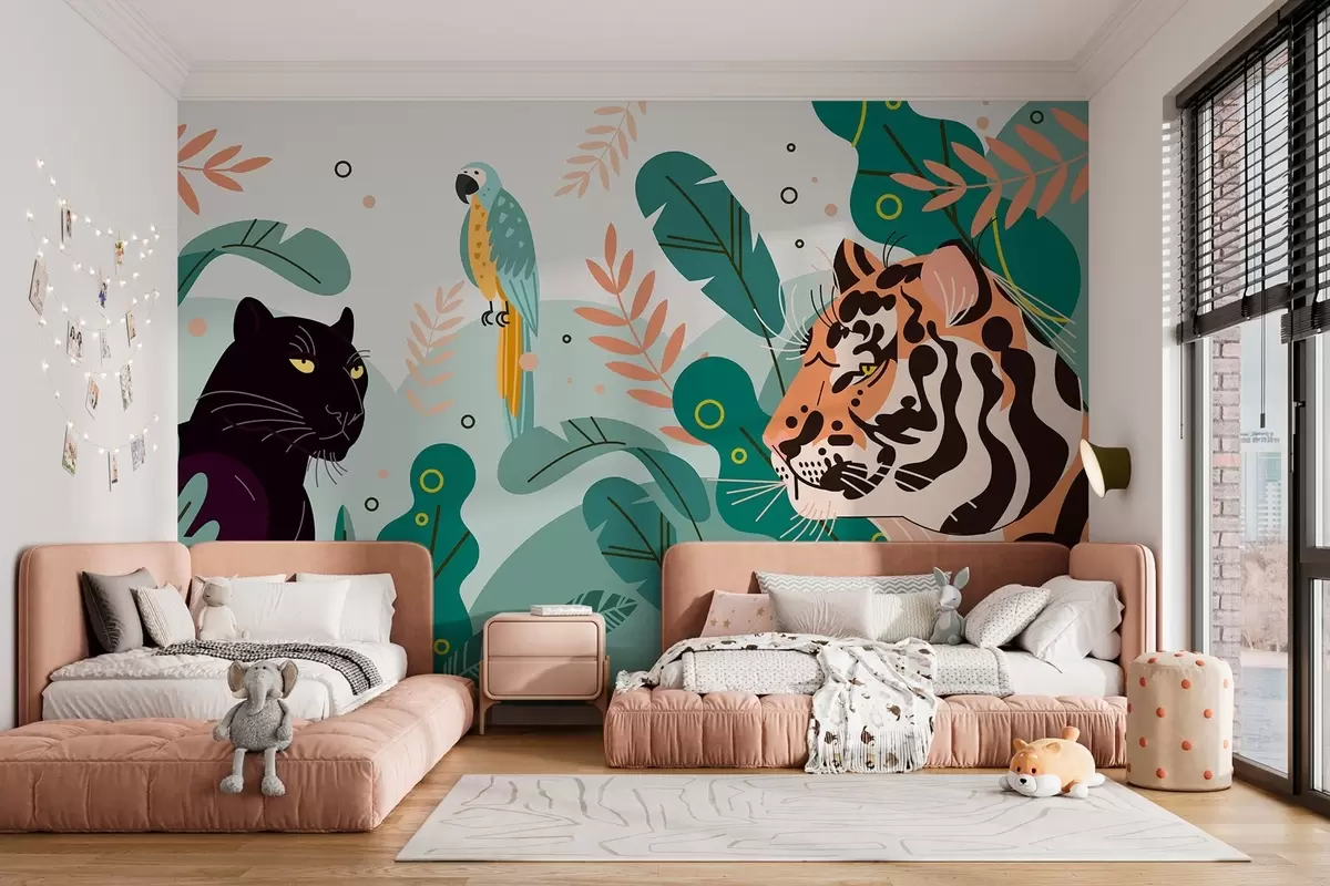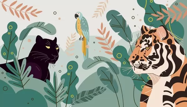 Тапете за зид џунгла са тигром, пантером и папагајем бр. w03958
