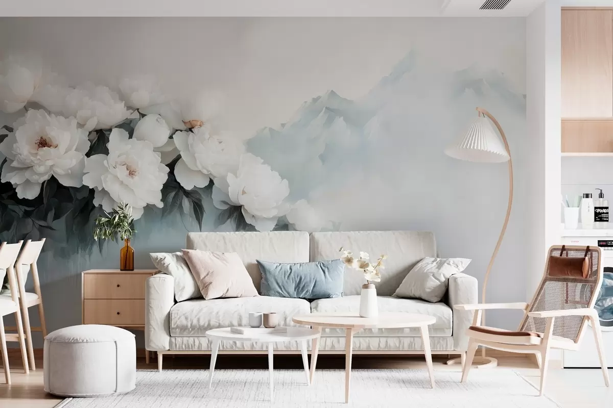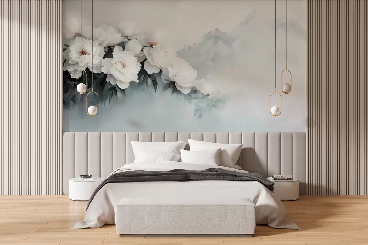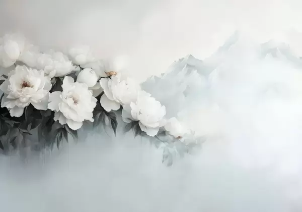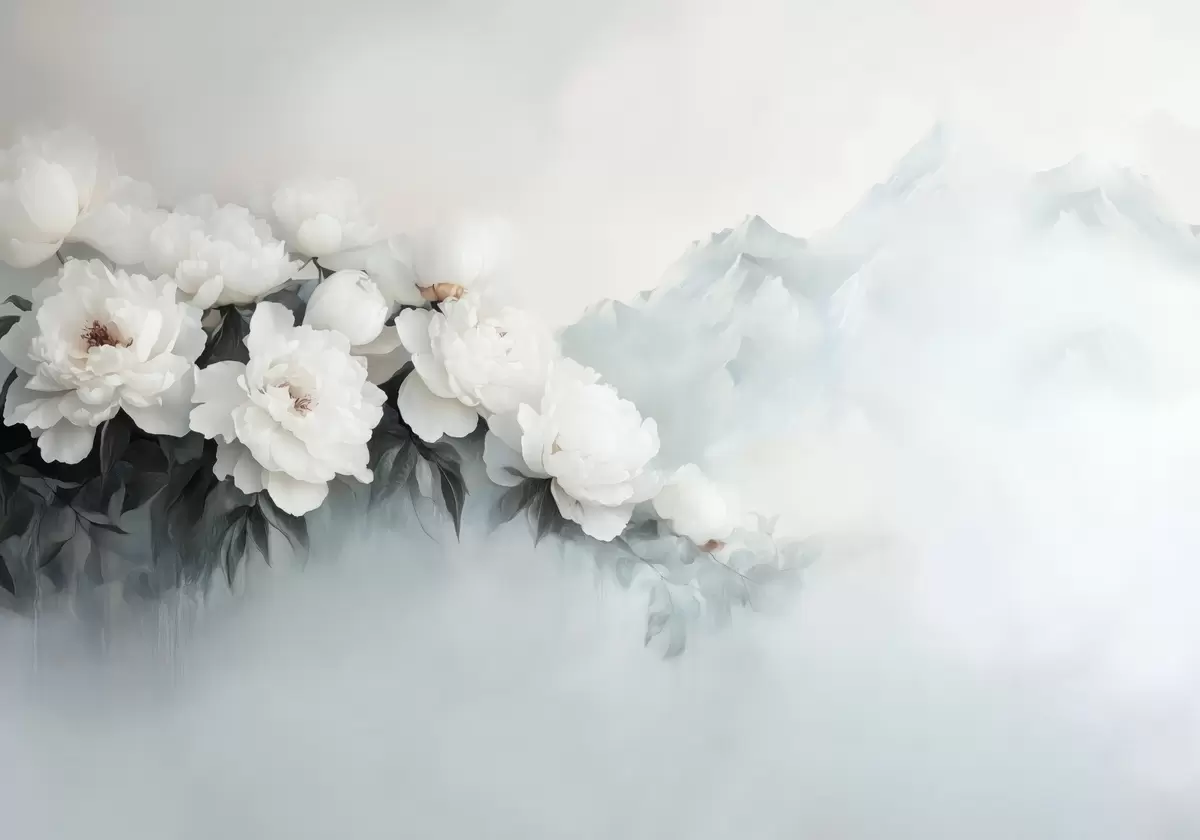 Тапете за зид сликовити бујни бели божури на позадини магловитих планина бр. w03965