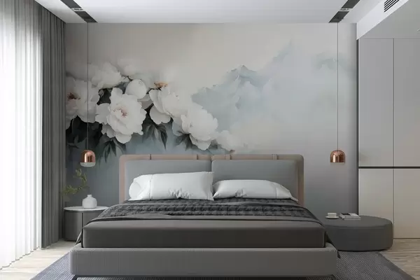 Тапете за зид сликовити бујни бели божури на позадини магловитих планина бр. w03965
