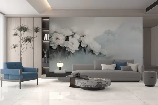 Тапете за зид сликовити бујни бели божури на позадини магловитих планина бр. w03965