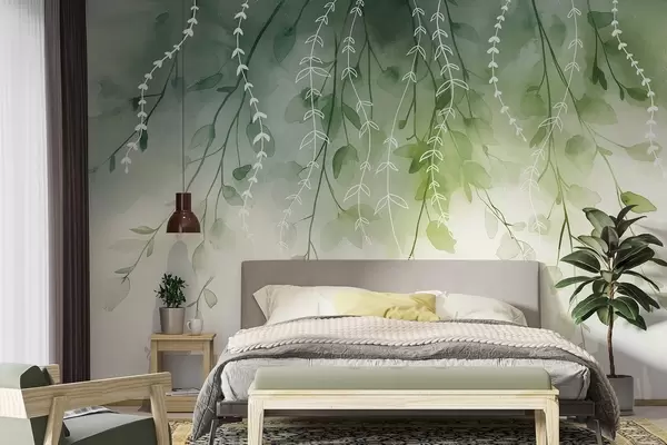 Тапете за зид Гране са листовима у акварел стилу, природне зелене боје бр. w04007