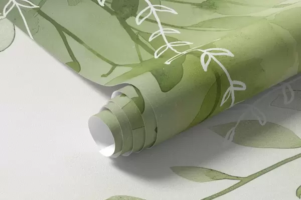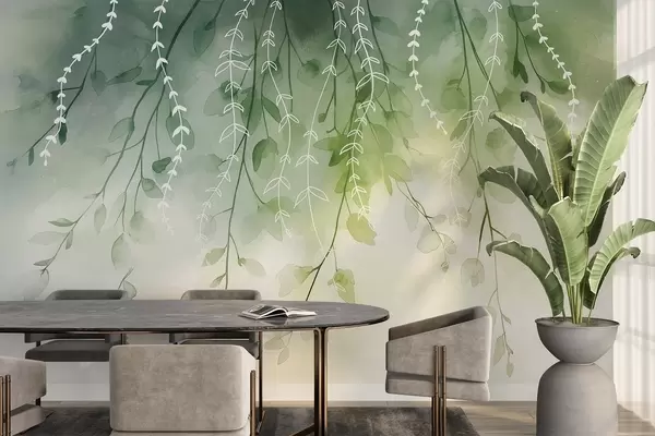 Тапете за зид Гране са листовима у акварел стилу, природне зелене боје бр. w04007