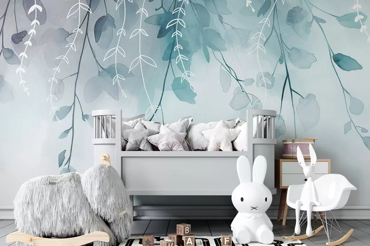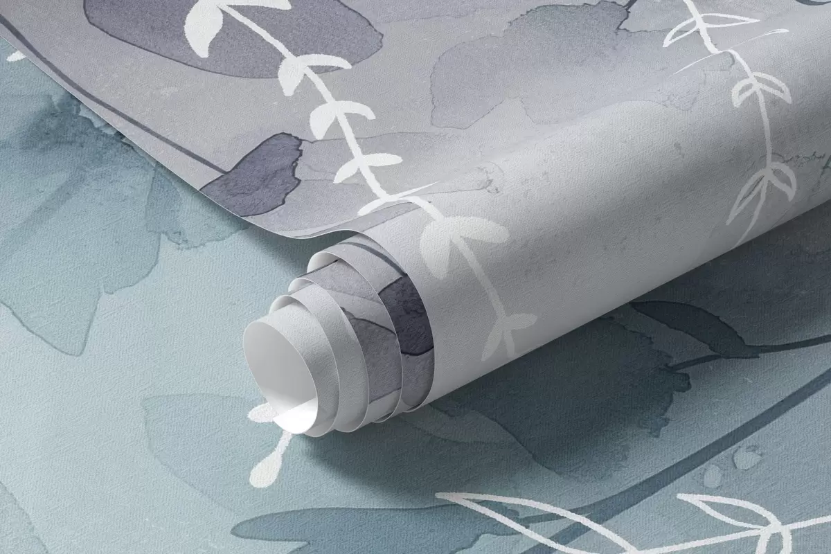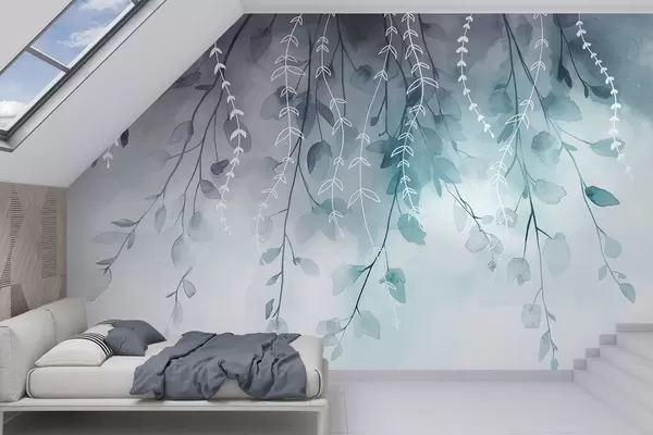 Тапете за зид Гране са листовима у акварел стилу, природне аквамарин боје бр. w04007v3