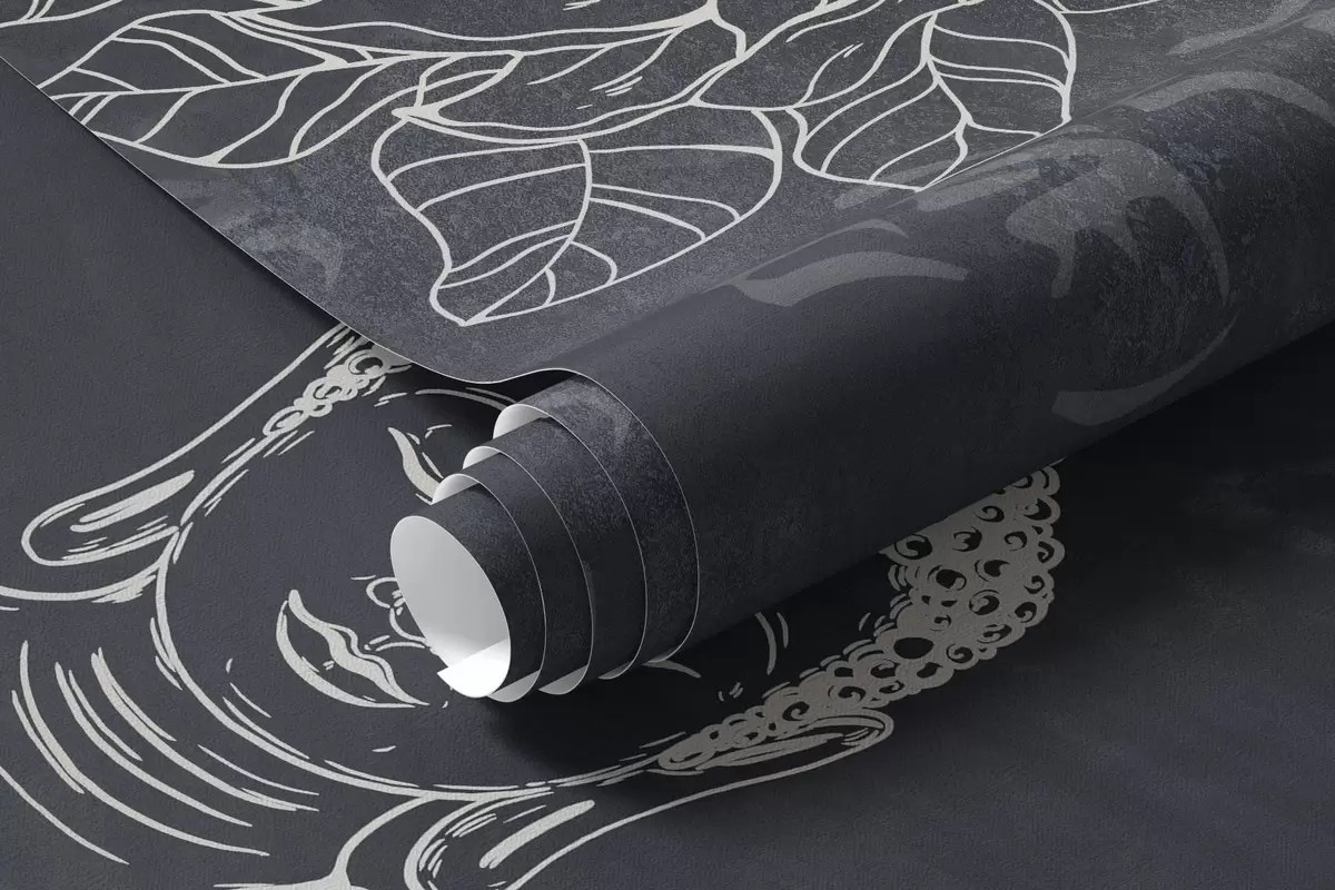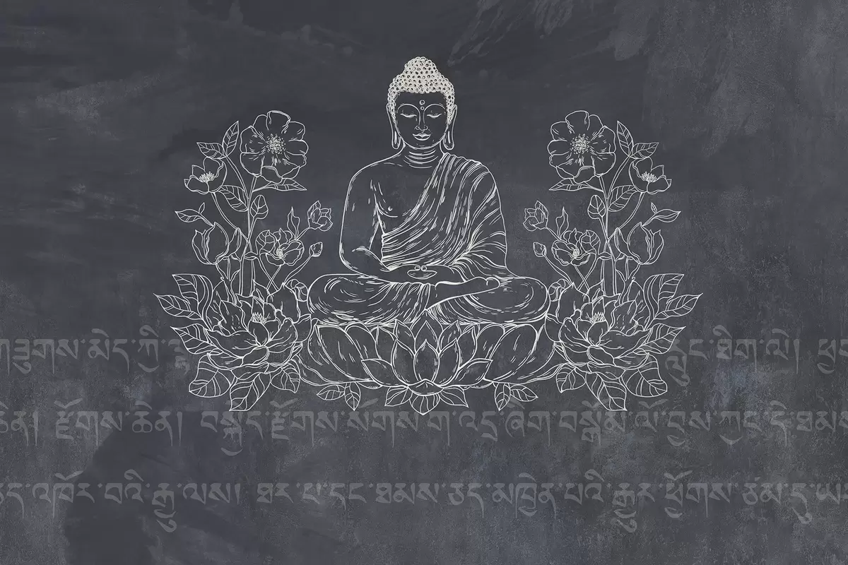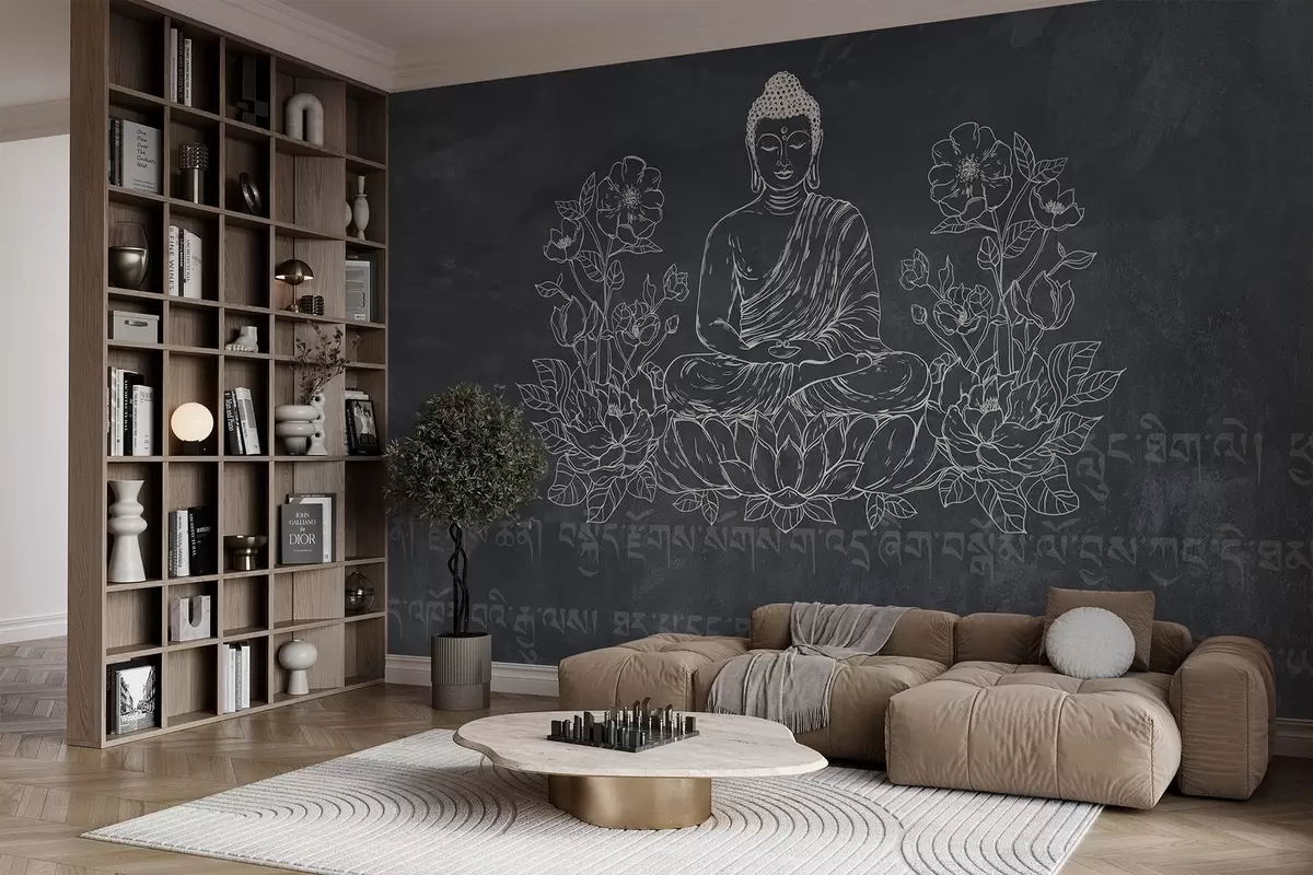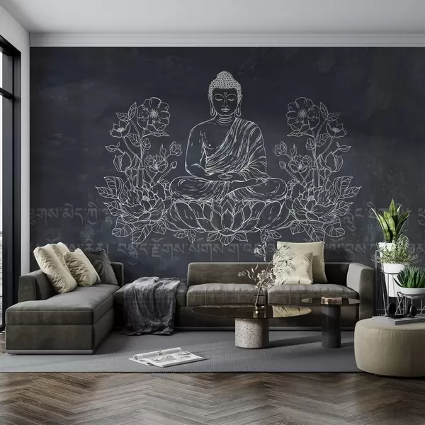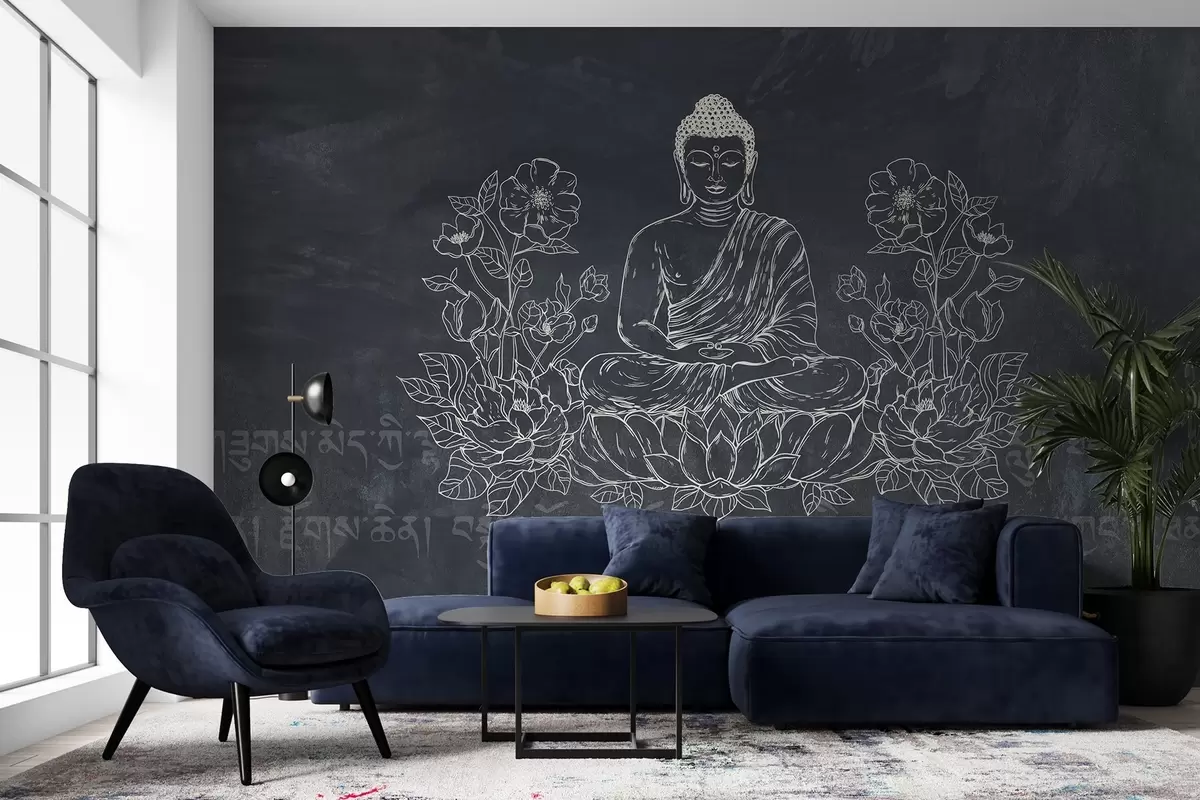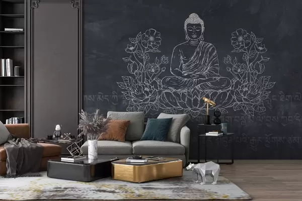 Тапете за зид Медитирајућег Буде са цветовима лотоса, линијске цртеже, оријенталне, тамне позадине бр. w04008