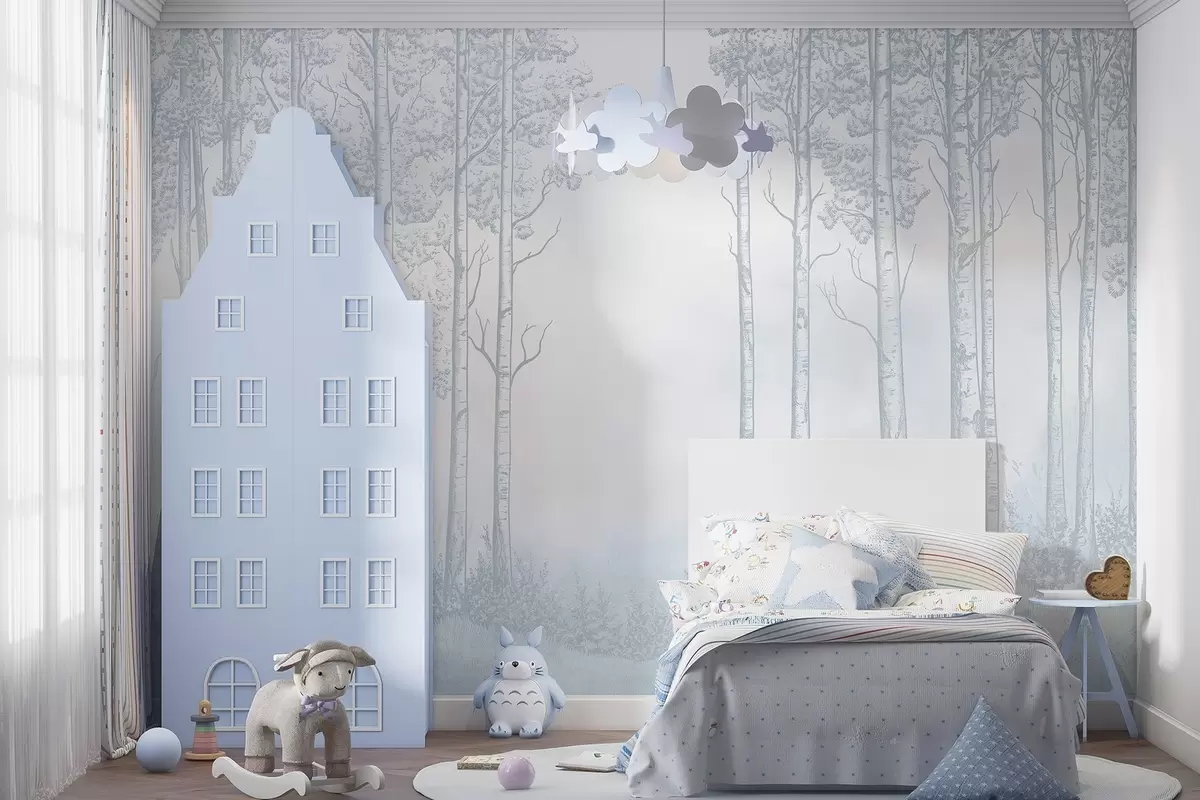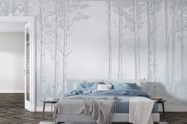 Тапете за зид Шума са брезама, минимализам, природа, плава палета боја бр. w04009