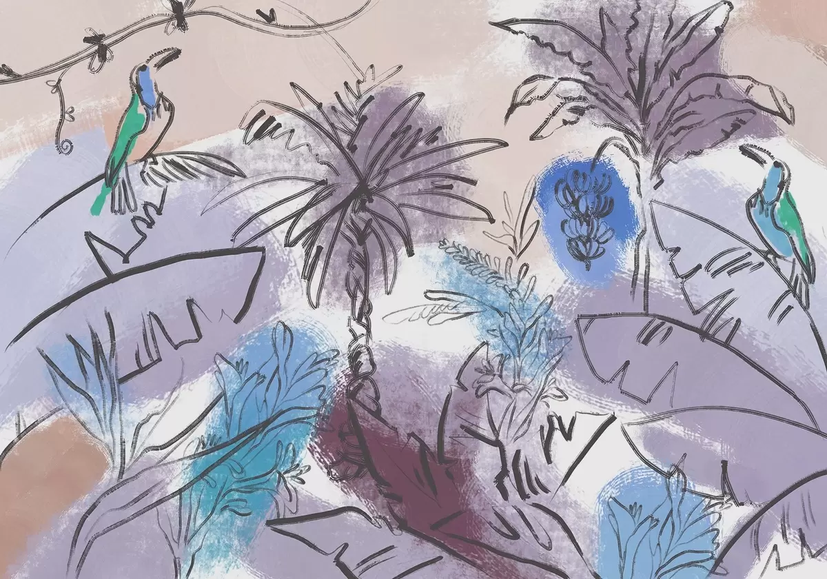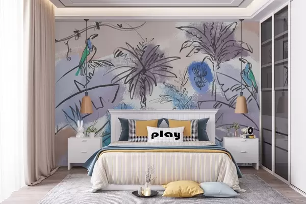 Тапете за зид Тропски принт са плавим цвећем, сликовити папагаји бр. w04019v2