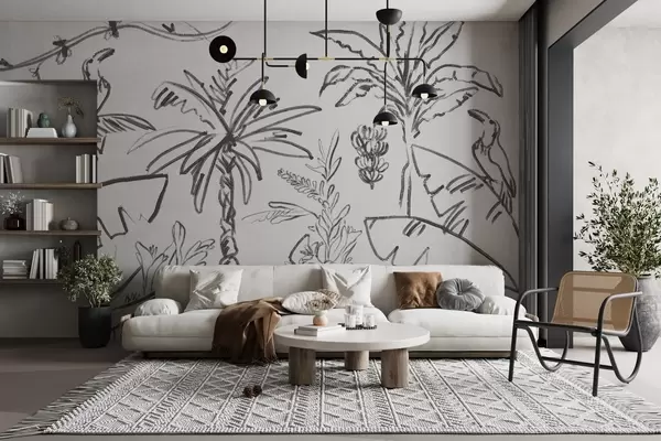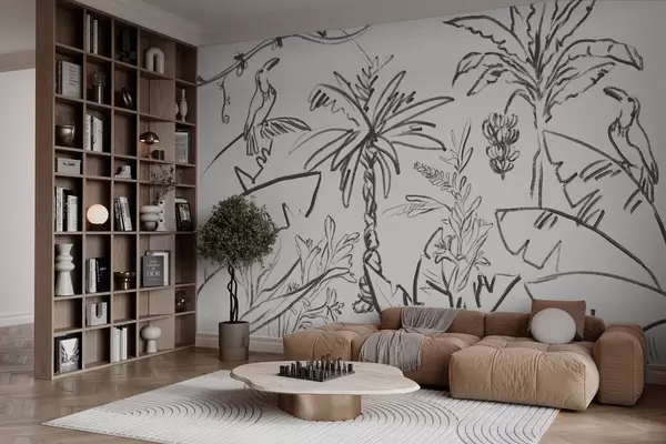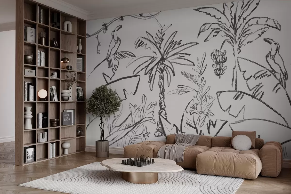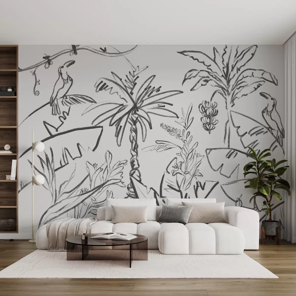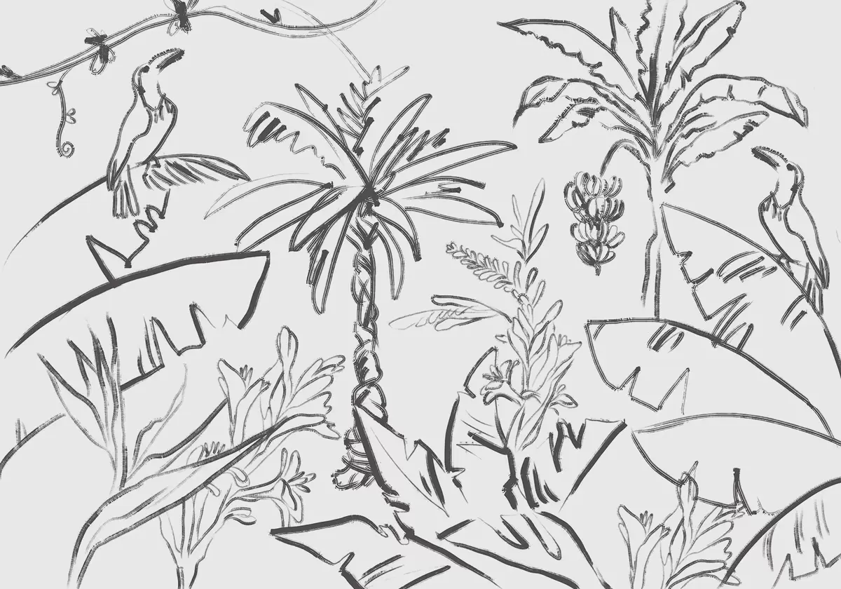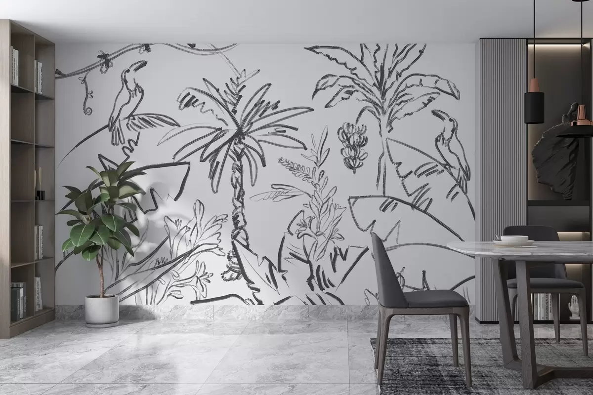 Тапете за зид Тропски цртеж линија, банане, палме, контурна графика бр. w04020